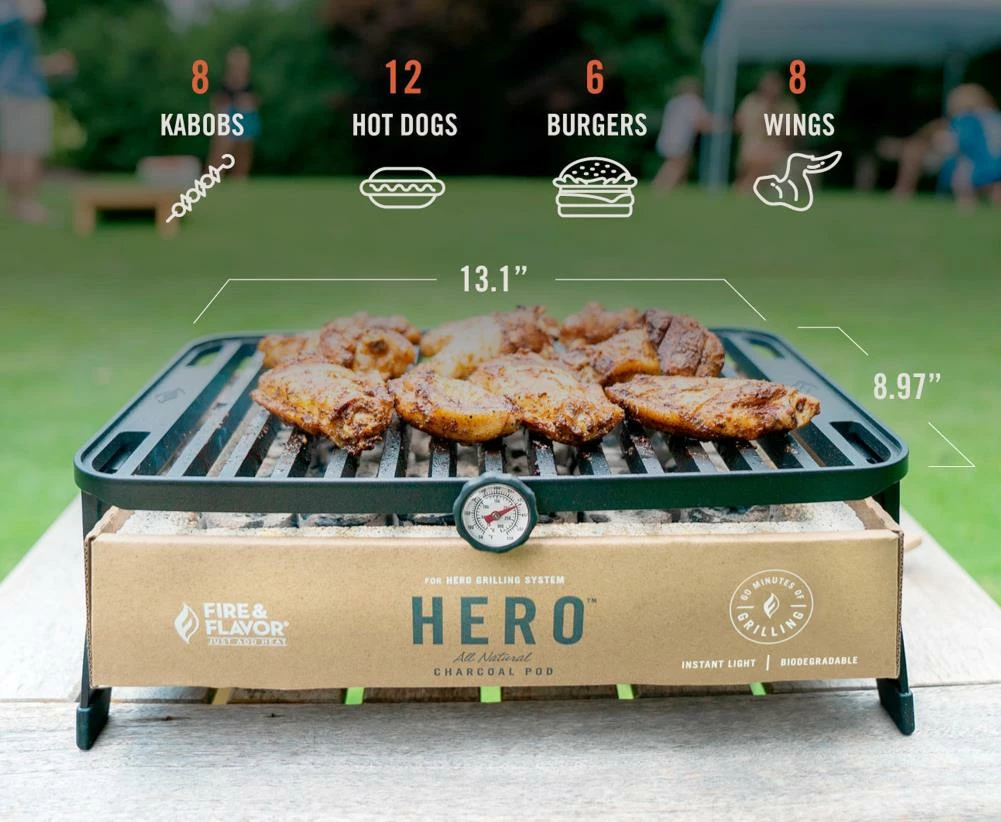 Hero™ makes grilling simple, clean, and portable. It features a fast set up and no mess, eco-friendly charcoal pods that are ready in ten minutes to give you an hour of grill time. The grill is dishwasher safe, making clean up fast and easy. The charcoal pods are an environmentally friendly fuel choice compared to petroleum based alternatives.
