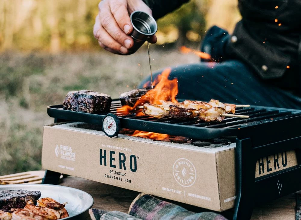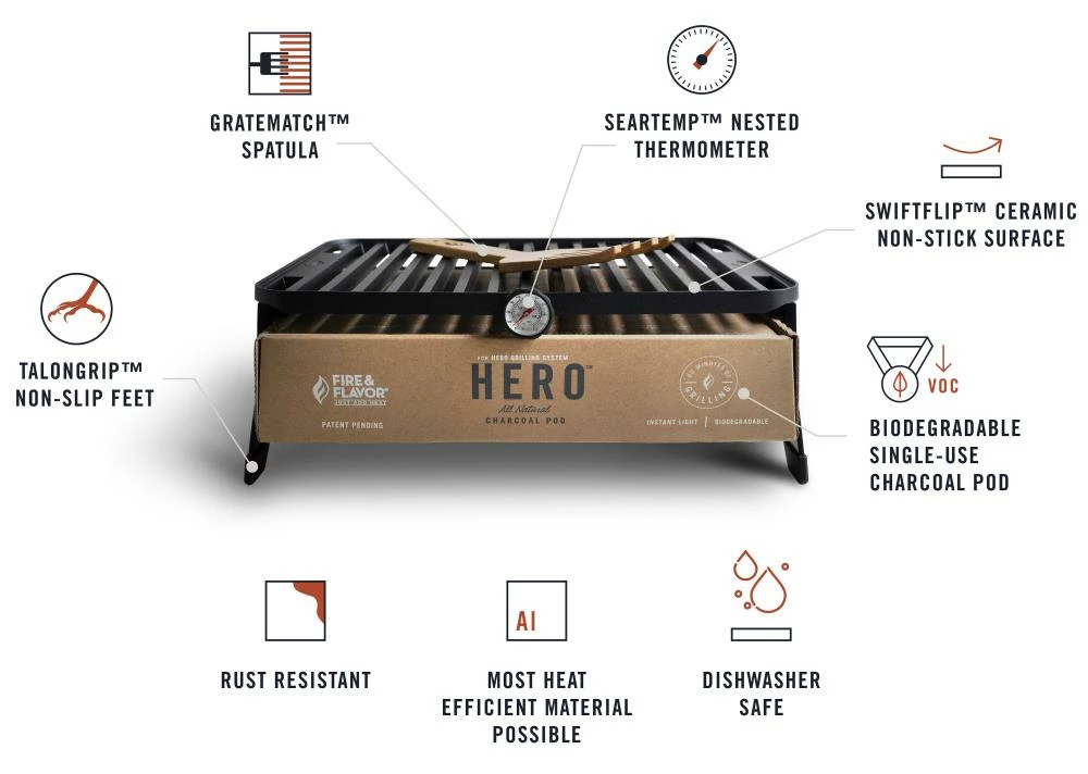 - The hero is the only premium quality small charcoal grill that is portable, lightweight, eco-friendly and packable