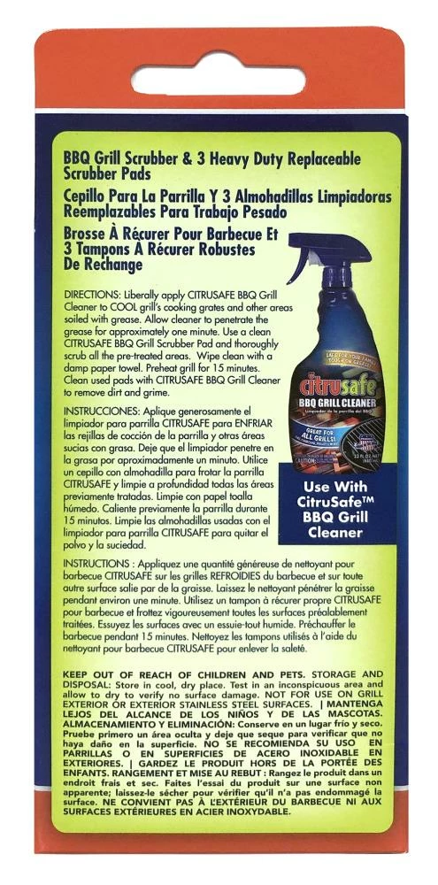 The Citrusafe™ heavy duty grill scrubber and replaceable scrubber pads were developed to work exclusively with Citrusafe™ BBQ grill cleaner to clean your grill cool!!! the combination of our heavy-duty recyclable pads and powerful biodegradable degreaser not only actually cleans your grill, it does so without the fear and dangers associated with wire grill brushes and the burn off method. You and your family can enjoy grilling out knowing you are safe from wire grill bristles breaking off in your food.
