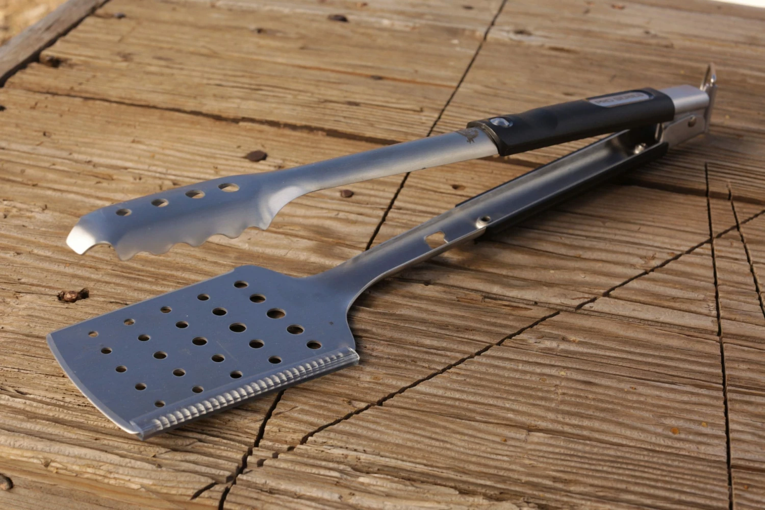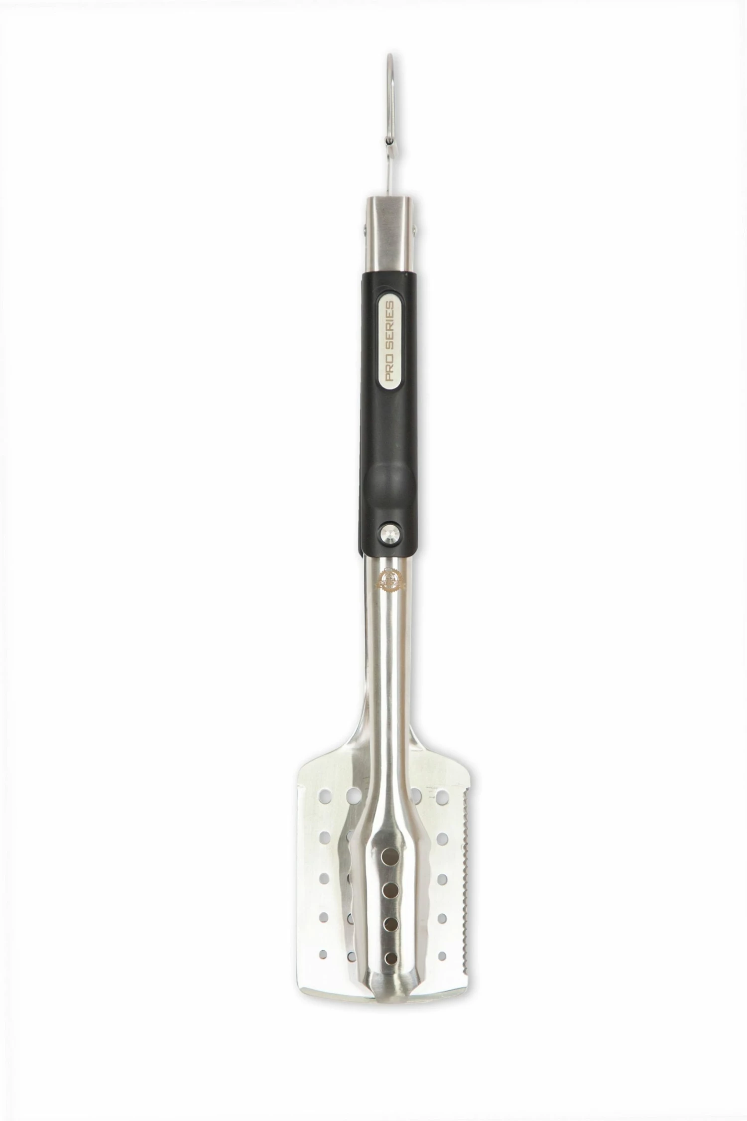 Pit Boss grills brings you the same innovation of the pro series grill with the pro series all-In-one tool. This unique design features a full spatula on one side and a raised ridge tong head on the other. You can easily open the tongs to a wide angle, and securely grip and flip a rack of ribs, thick cuts of steaks, large briskets and more. The double-thick stainless-steel construction offers durable and long-lasting use. In addition, an extra-long handle allows for grilling at a comfortable distance away from the grill heat while the nylon polymer grip provides heat resistance of up to 400รย F. the spatula has a multi-functional build that boasts a meat cleaver on one edge and a serrated tenderizer on the other and a convenient built-in bottle opener on the handle while surface holes on the spatula and tong head creates convenient drainage when handling food. Additional features include a locking tab that pulls in and out for easy storage and an enlarged hanging loop for effortless storage.