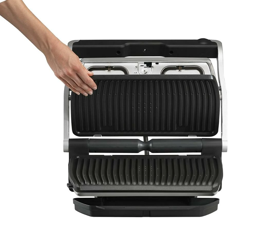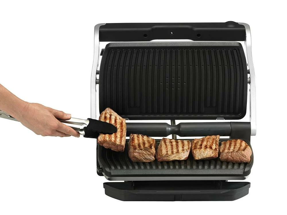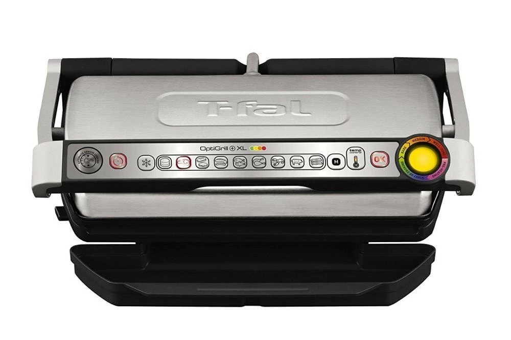 Enjoy perfectly grilled and healthy food for your family and friends all year long with the indoor OptiGrill plus XL. Thanks to its unique thickness measurement Technology for 9 automatic programs, you can enjoy perfect grilling results with the temperature and the cooking time being automatically adjusted to your favorite food. With 3 additional settings (seafood, pork and bacon) and a 33% larger cooking surface than the classic OptiGrill, the OptiGrill plus XL keeps all your food juicy and full of flavor for the whole family. The indicator light and the audible beep tell you where your food stands in the cooking process; green for start of cooking, yellow for rare, orange for medium and red for well done. To please everyone’s taste, lift up the lid and remove the food when it is ready and leave the rest to keep cooking to your desired oneness. Even frozen food regains all its flavor in a couple minutes thanks to the frozen mode. The manual modes with adjustable temperature give your fruits, vegetables or any other personal recipes the delicious and unique taste of grilled food. With removable plates inclined at 7 degrees fat can easily run off. The non stick aluminum plates and the drip tray are removable, easy to clean and dishwasher safe. Its stainless steel design gives a dynamic and modern look to your kitchen. Enjoy the T-fal OptiGrill plus recipe book that offers new irresistible recipes ideas for everyone!