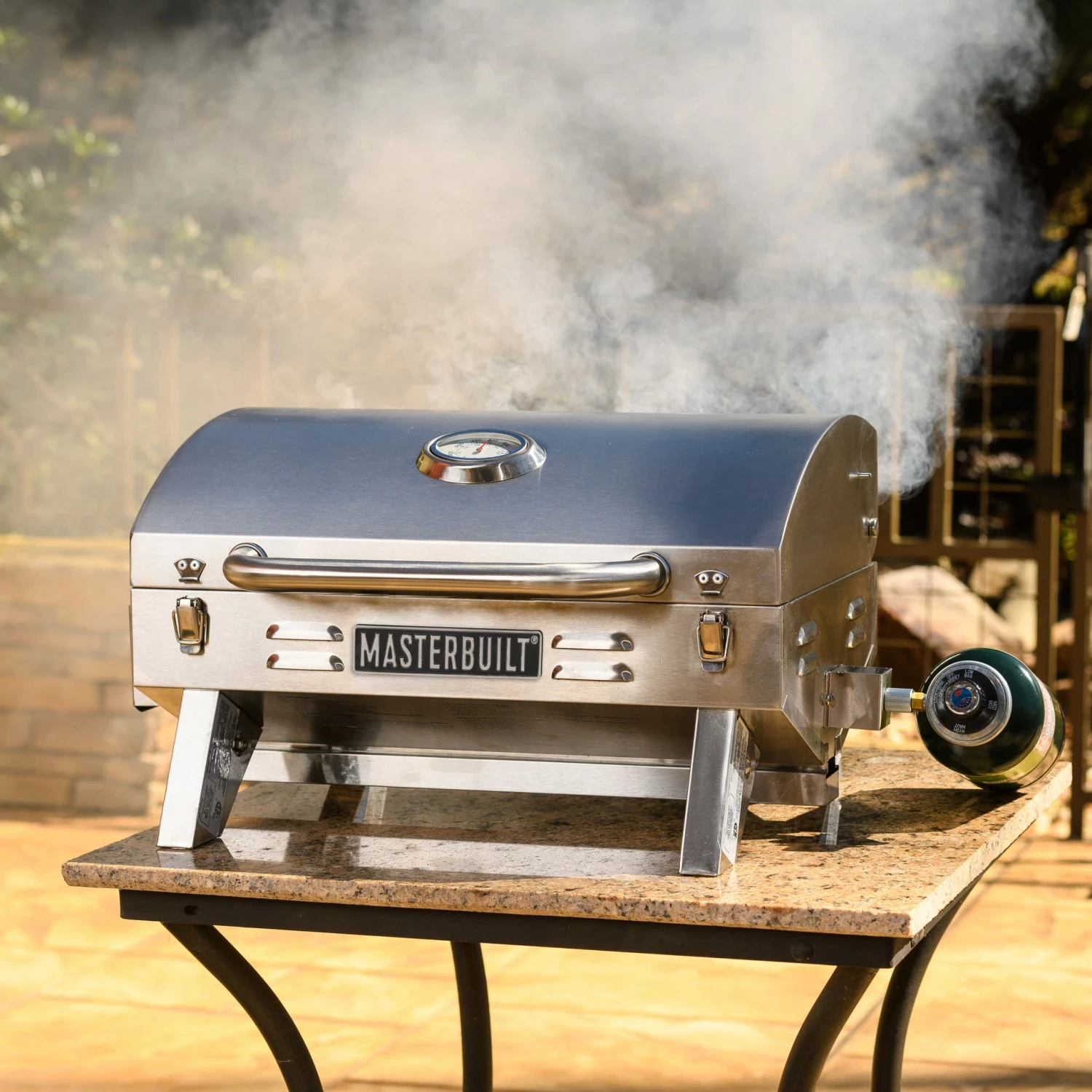The Masterbuilt Propane Tabletop Grill is built for BBQ-grillers on the go and perfect for camping, tailgating, picnics, or any outdoor use. The compact design with locking lid, folding legs, and a large front carry handle makes this grill very portable and easy to transport or store. The grill operates on small, disposable, one-pound propane cylinders (not included), which are available nationwide as a common camping accessory item. The long-lasting stainless steel construction allows you to experience outdoor cooking wherever you enjoy it most.