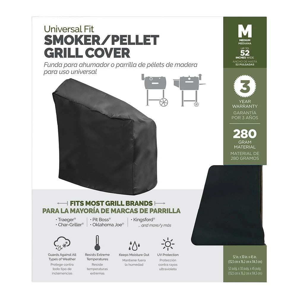 Protect your grill with a Universal fit smoker/pellet grill cover. This cover fits various pellet grills and smokers up to 52 inches wide and will guard your grill from the elements all year long. Keep your grill safe from extreme hot and cold temperatures and harmful UV rays, while keeping moisture out. Equipped with a drawstring closure, your cover will be safe and secure whenever your grill ism’t in use.