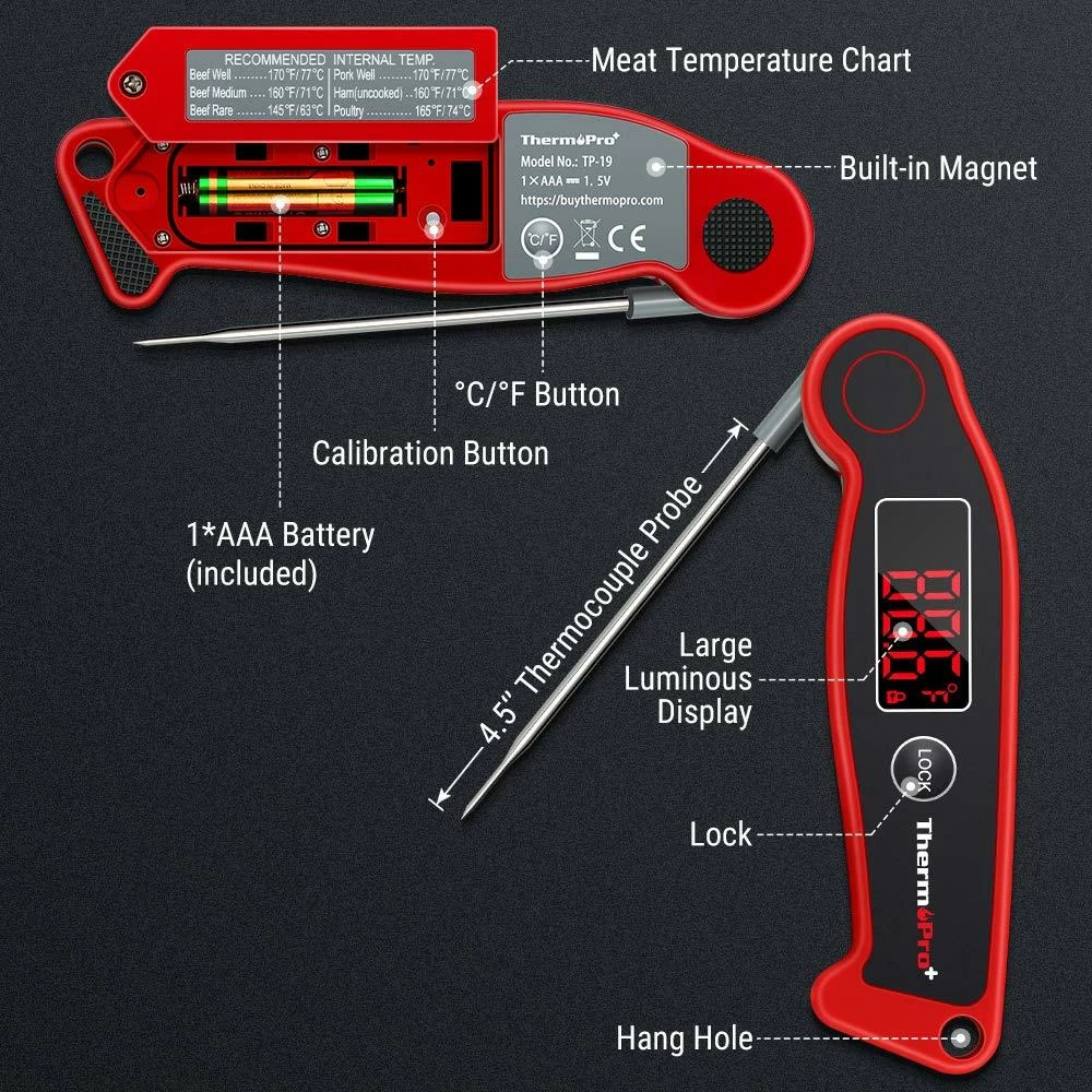 Start delivering properly cooked food to the table by using a food temperature thermometer. The ThermoPro TP19 waterproof electric meat thermometer is the ultimate choice for ultra fast measurements to determine if your food is safe for consumption. Using it’s ultra-sensitive and fast thermocouple sensor, this cooking thermometer with probe can deliver the fastest readouts on the market in just 2-3 seconds.