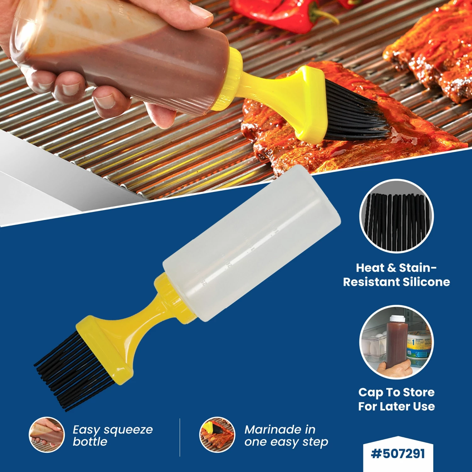 The silicone basting bottle with cap is the perfect tool to baste your food in one easy step. Fill it with your favorite marinade and then cover the bottle with the cap to store the left over sauce. The bristles are stain- and heat-resistant.